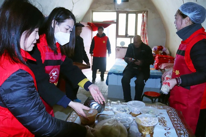對于行動不便的老人,志愿者們上門服務(wù),為他們送去熱氣騰騰的愛心午餐。